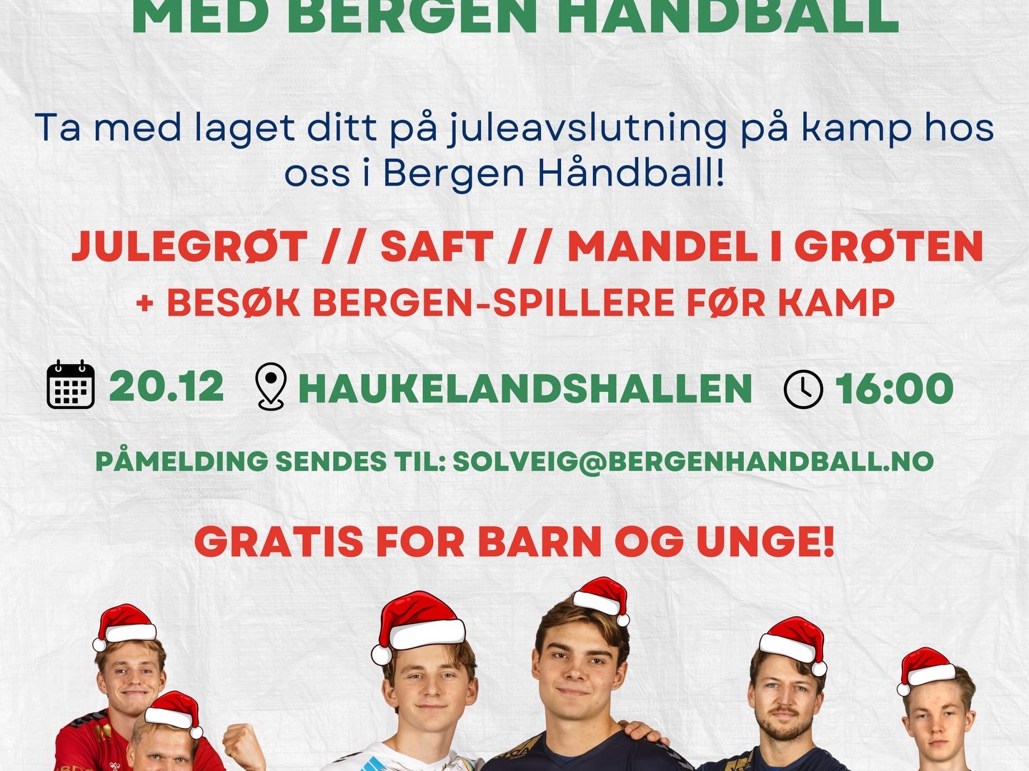 Julen nærmer seg og med det inviterer Bergen håndball til juleavslutning 20. desember. Før kamp klokken 16:00 blir det julegrøt, saft og Bergen spillerene kommer også innom en tur før kampstart. Kanskje kommer nissen også?🎅